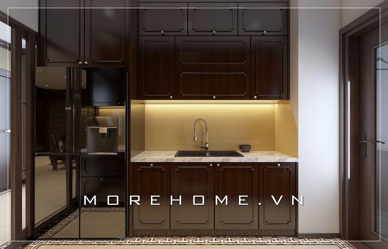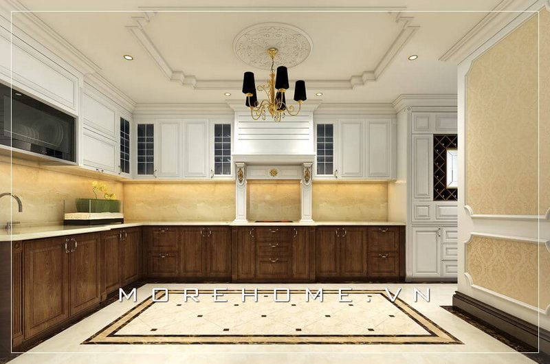Chất liệu gỗ tự nhiên cao cấp được sử dụng làm tủ bếp tân cổ điển cách tân ít các chi tiết rườm rà cho không gian vừa cao cấp, vừa tiện nghi