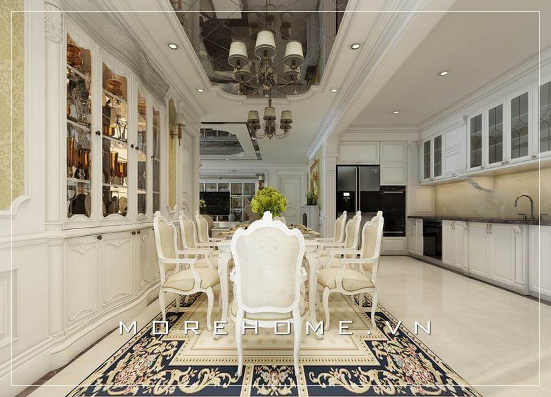 Mẫu tủ bếp biệt thự tân cổ điển được làm từ gỗ tần bì phun sơn màu trắng cao cấp, những nét hoa văn cầu kì, tỉ mỉ tạo nên một không gian cuốn hút mà bất kì ai cũng muốn sở hữu