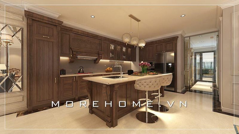 Thiết kế tủ bếp gỗ tự nhiên nhập khẩu cao cấp ấn tượng, các chi tiết chạm khắc tỉ mỉ, tinh tế mang lại không gian sang trọng