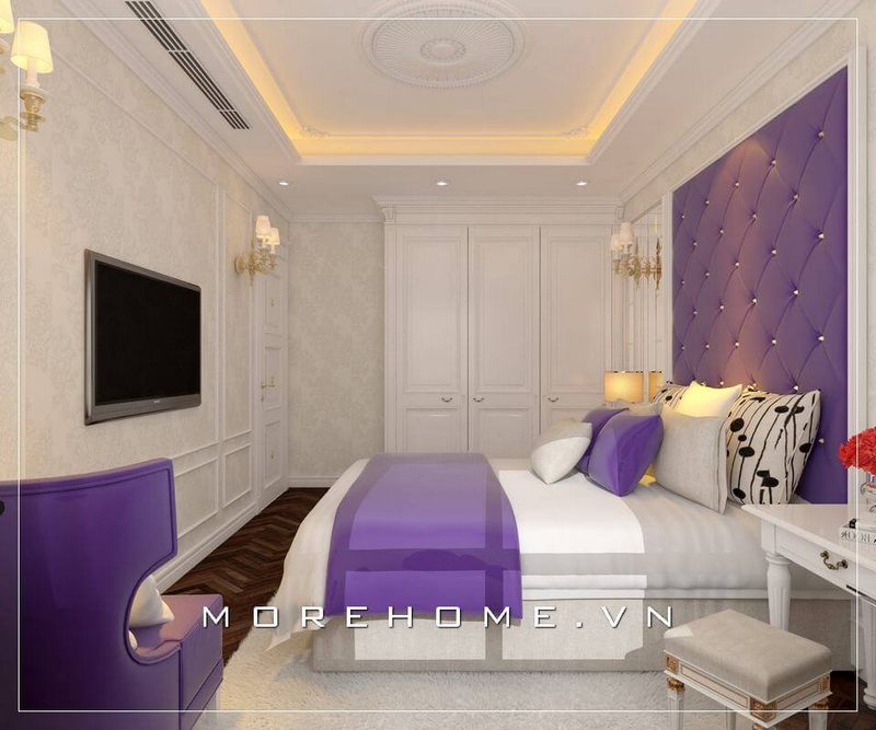 Nội thất phòng ngủ nhỏ được bố trí một cách hài hòa, hợp lí, mảng đầu giường bọc da màu tím cuốn hút tạo sự sinh động hơn cho căn phòng