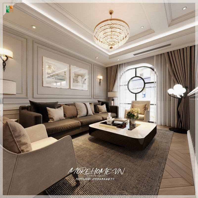 Phong cách thiết kế hiện đại đã được áp dụng cho không gian phòng khách, với gam màu chủ đạo trung tính tạo nên sự ấm áp và sang trọng cho khu vực này.