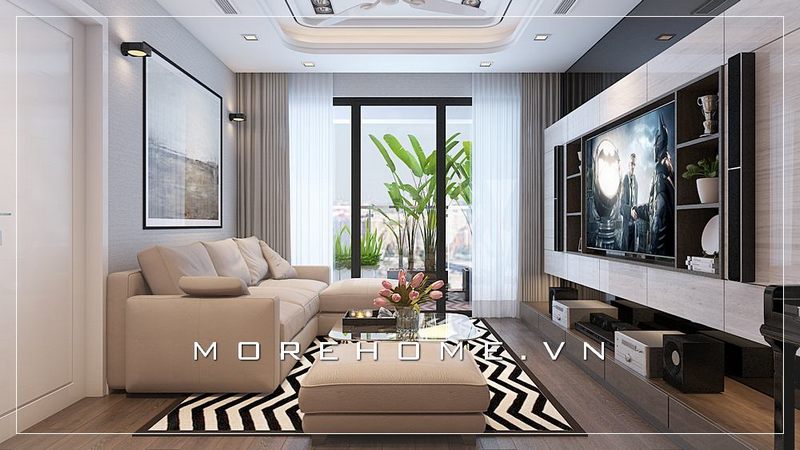 Sofa da màu trắng sáng mang lại vẻ đẹp tinh tế và gọn gàng cho phòng khách căn hộ chung cư diện tích nhỏ, góp phần tạo nên một không gian thoải mái và đầy năng động.