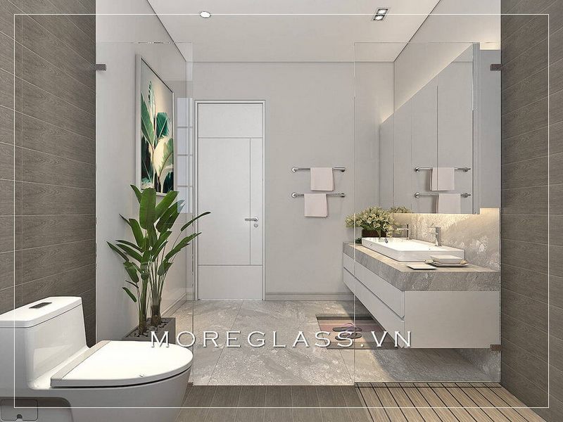 Nhà tắm và nhà vệ sinh được thiết kế thông minh với việc sử dụng vách kính cường lực trong suốt để ngăn cách, tạo nên một không gian sử dụng tiện nghi, sang trọng.